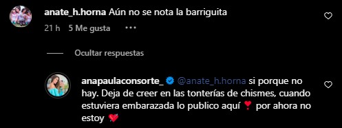 A través de sus redes sociales, Ana Paula Consorte publicó una foto con ropa deportiva en la que mostraba su tonificado abdomen, a lo que una usuaria no perdió el tiempo y señaló que “aún no se nota la barriguita” en referencia a un supuesto estado de gestación.