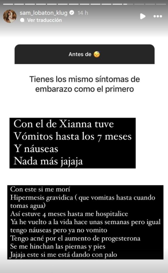 «Con el de Xianna tuve vómitos hasta los siete meses y náuseas, nada más ja, ja, ja. Con este sí me ‘morí’. Tuve hiperémesis gravídica, así estuve cuatro meses, hasta me hospitalicé. Ya he vuelto a la vida hace unas semanas pero igual tengo náuseas, pero ya no vomito», se lee en el story. Asimismo, mencionó que su cuerpo ha sufrido cambios como en el acné e hinchazón de sus manos y piernas.